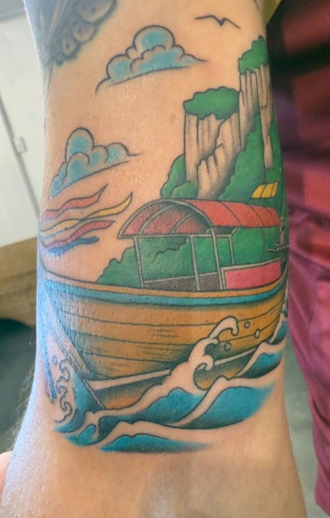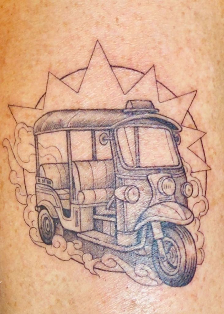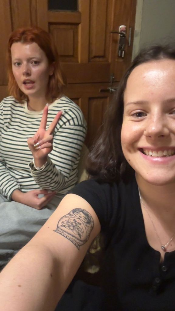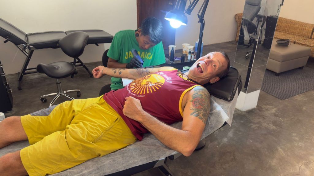 Biblical rain for the last couple of days inspired us to craft a raft to get from our bed to the bathroom after the ceiling gave way, and then we found a toad in Jem’s shoe the size of small pig. We spent the last day in the tattoo parlour to get commemorative designs for our trip. Jem spent about six hours getting violated by the tattoo gun which was nothing short of heroic.